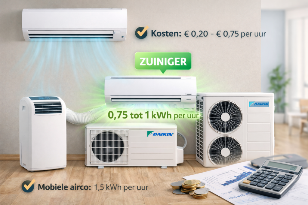 Mobiele airco’s gebruiken meer (ca. 1,5 kWh/uur) dan vaste systemen (single split: ca. 0,75–1 kWh/uur).